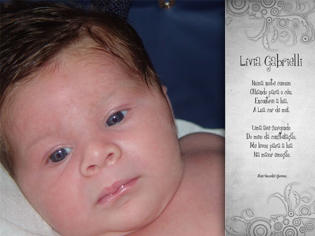 Meu nome é Lívia Gabrielli, nasci no dia 05 de outubro de 2004 no hospital Artur Ramos - Maceió-Alagoas, às 10h59. Tenho os pais mais lindos do mundo! Luciano Amancio da Silva e Nívia Maria da Silva Amancio. Hoje, estou com 5 aninhos e estou no Jardim II. Sim... já ia me esquecendo... já sou titia, o nome dela é Esther! Uma bebezinha linda de morrer!!! Bem... é isso, agora vocês conhecem um pouquinho de mim... agora participem! deixem seus comentários!!!